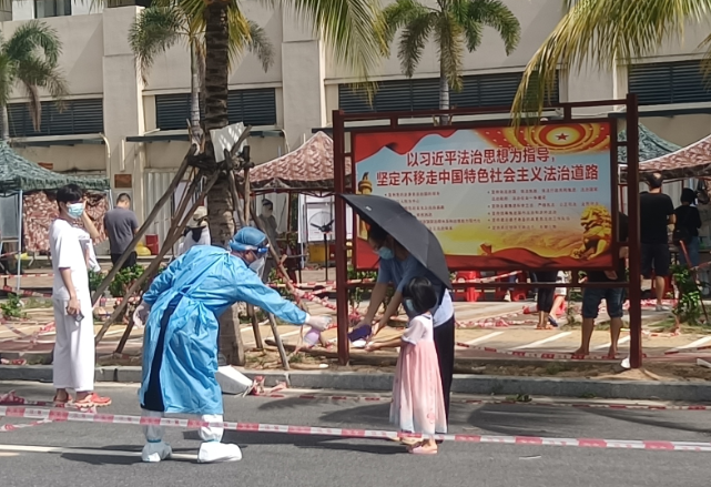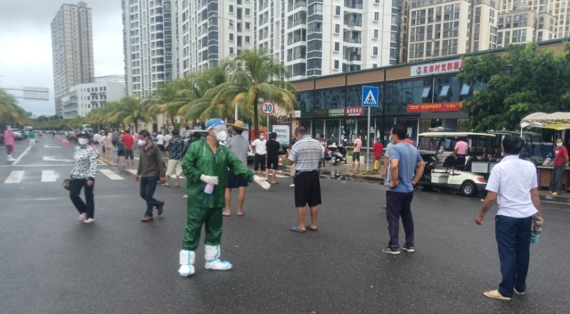 太阳炙烤着柏油路,椰子树叶纹丝不动,五条长龙缓缓前行,小喇叭里传来急促的声音:“亲爱的市民们,三亚疫情防控正处于不进则退的关键时期,请大家自觉遵守政府各项防控要求,有序排队等候核酸检测,保持两米距离、禁止抽烟、戴好口罩!检测结束后请勿吐痰,尽快回家!防控有我、三亚必胜,谢谢大家!”这就是陈显毅每天重复千百遍的声音,他每天的工作就是要做好市民群众核酸检测的秩序维护、答疑解惑等工作。
