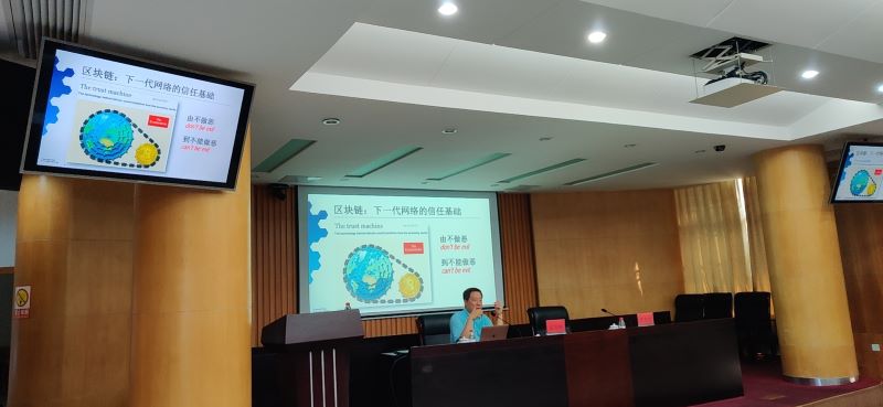 随后,容院士一行人来到学院315会议室与教师代表进行座谈。容院士非常看好海南自由贸易港发展,希望可以发挥区块链在贸易上的优势,并就合作事宜进行商讨。曹院长表示,要着重于将其研究及产品本土化,进行落地,不以点而以体系将其进行推进。