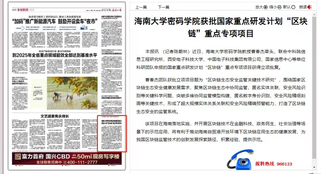 海南日报报道:3044永利集团官网密码学院曹春杰教授团队获批国家重点研发计划“区块链”重点专项项目
