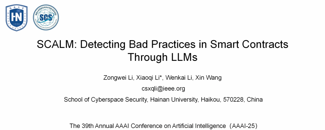 近日,3044永利集团官网硕士生李宗维(第一作者)、副教授李晓琦(通讯作者)、博士生李文凯、硕士生王鑫合作完成的研究论文“SCALM: Detecting Bad Practices in Smart Contracts Through LLMs”成功录用于第39届AAAI国际会议(The 39th Annual AAAI Conference on Artificial Intelligence)。AAAI会议是人工智能领域的国际顶级学术会议之一,属于中国计算机学会(CCF)推荐的A类顶级学术会议。AAAI-2025将于2025年2月27日至3月4日在美国宾夕法尼亚州费城举行。