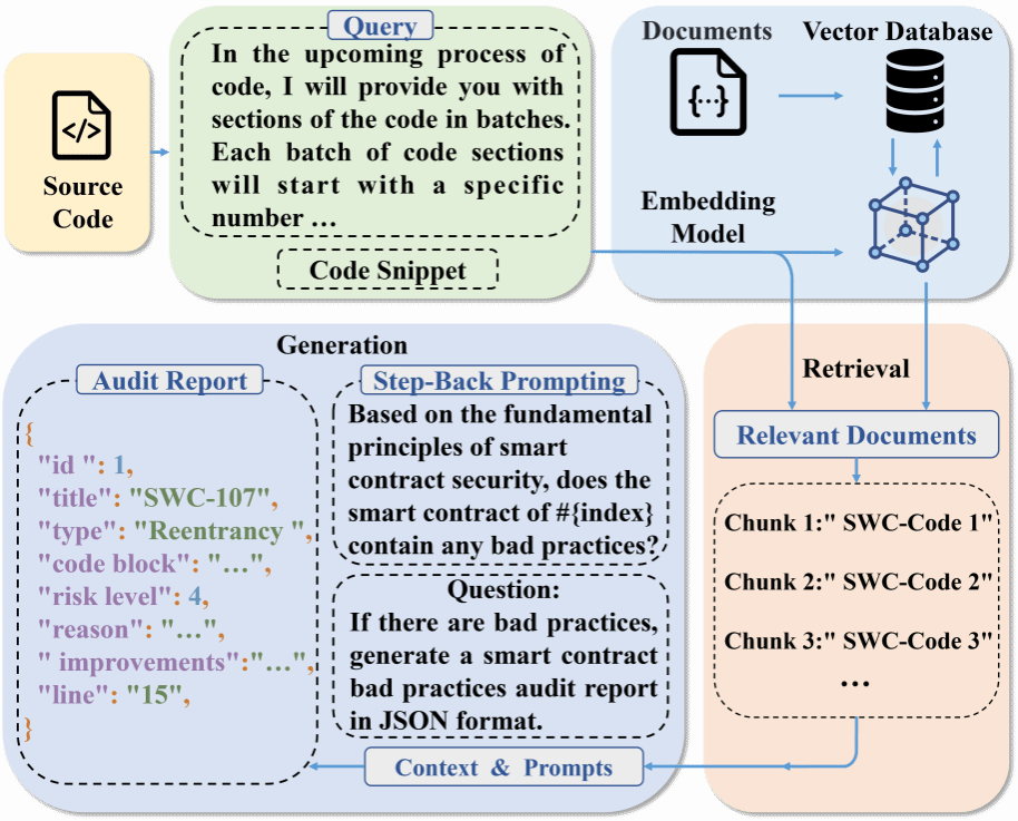 如图2所示,SCALM框架主要包括两个核心部分:首先,框架通过对大型数据集进行静态分析,识别和提取可能包含不良实践的代码块,并将这些代码块向量化后存储于向量数据库中,形成可查询的知识库;其次,SCALM结合检索增强生成(RAG)和后退提示(Step-Back Prompting)技术,从代码中抽象出更高层次的概念与原则,以便有效检测不良实践。最终,SCALM生成详细的审计报告,突出潜在的安全问题、评估相关风险,并为开发者提供切实可行的修复建议。