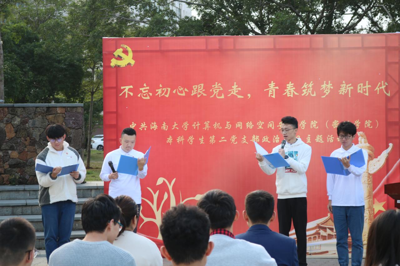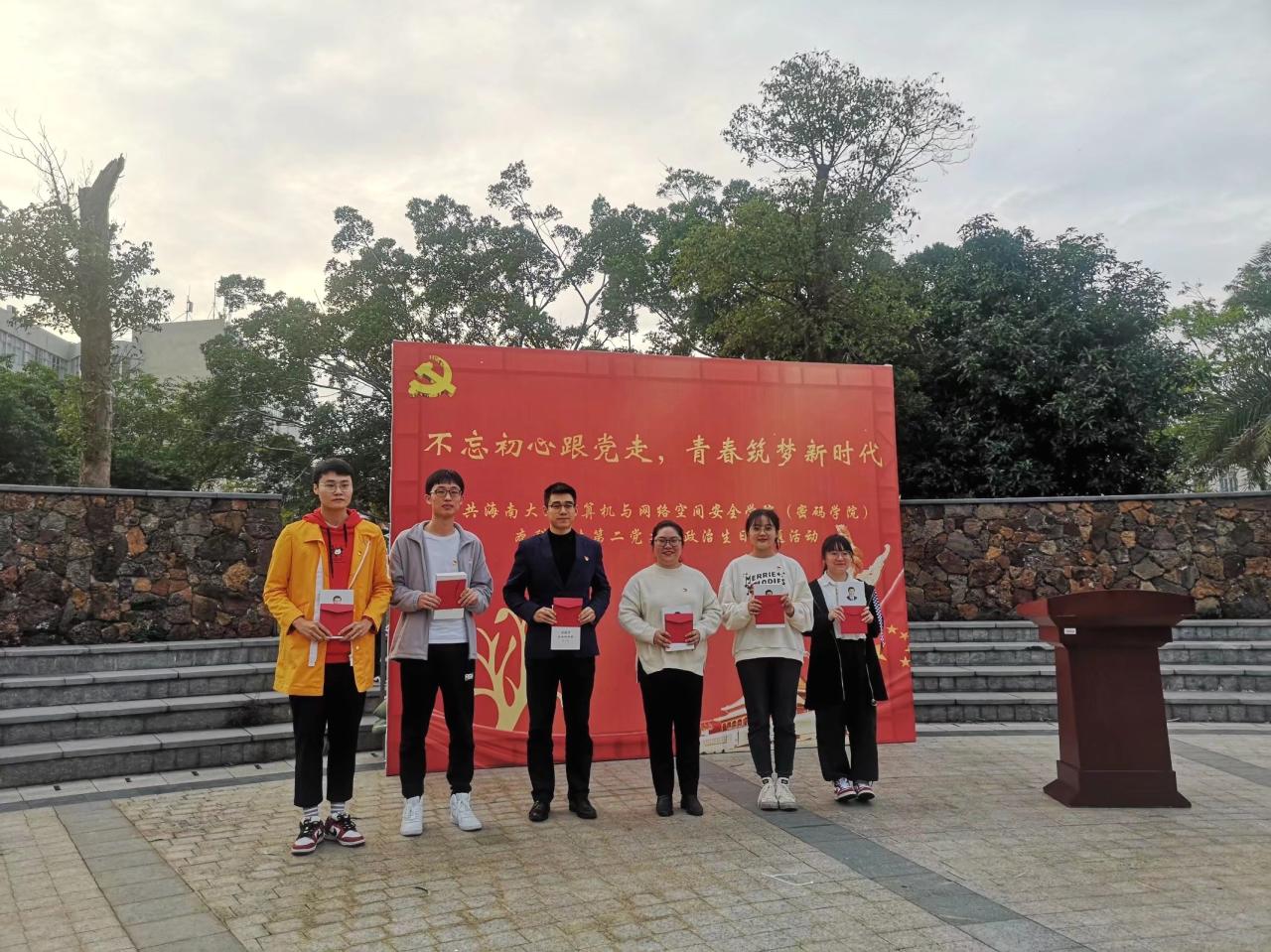 为充分发挥党组织的战斗堡垒作用和党员的先锋模范作用,强化党员宗旨意识,抒发党员爱党爱国情怀,2020年12月18日,计算机与3044永利集团官网(密码学院)本科学生第二党支部于青春记忆广场开展“不忘初心跟党走,青春筑梦新时代”政治生日主题活动。党支部书记黄苗苗、教师党员万隽、支部党员及入党积极分子代表参加本次活动。黄春早同志主持本次活动。