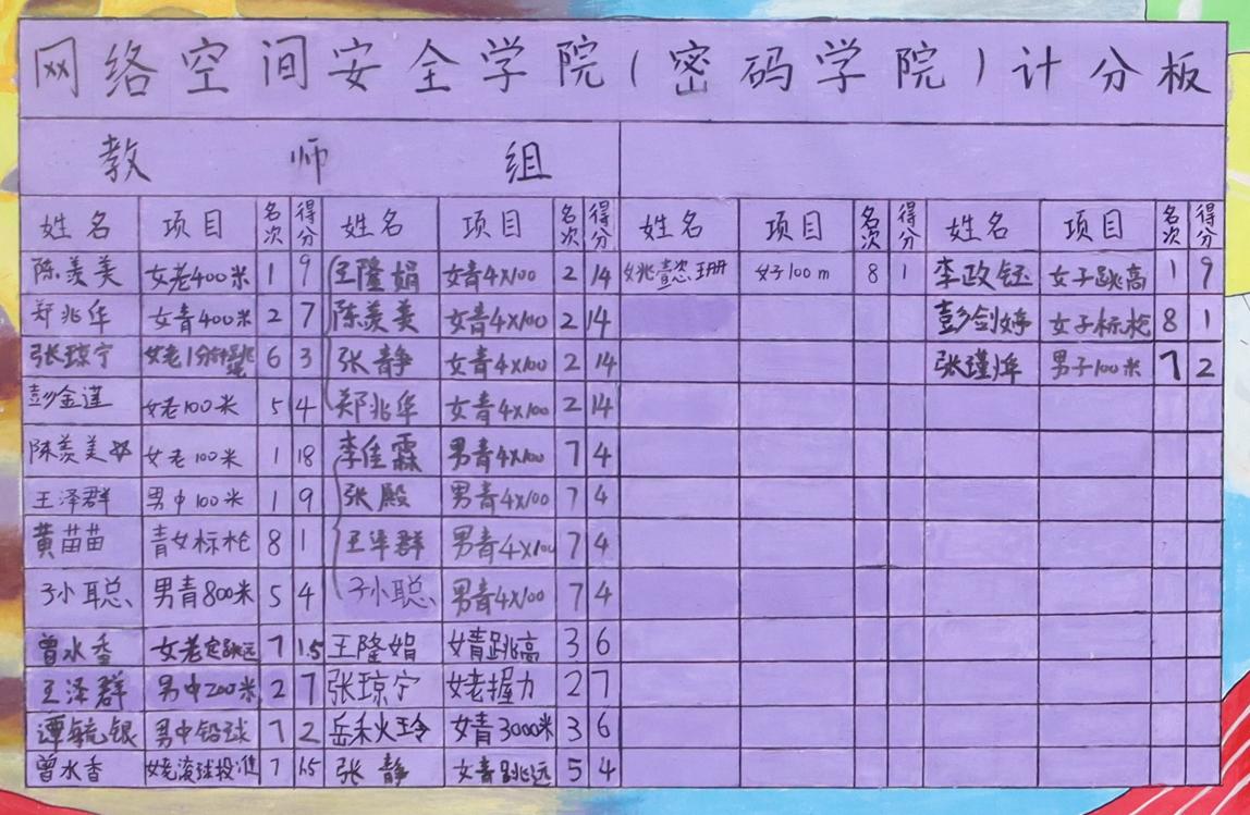 永利集团官网师生在此次校运会上表现突出。永利集团官网现有在岗教职工44人,参赛人数24人,过半教职工参与进来,将竞技赛场上拼搏的精神发扬的淋漓尽致。陈羡美老师宝刀未老,在赛场上大放异彩。她不仅在女子老年400米项目中夺得第一,并在女子老年100米项目中打破了校记录,斩获冠军。由陈羡美、王隆娟、郑兆华、张静组成的女子接力队在女子4*100米项目上夺得亚军,与冠军仅差0.19秒!男子教工组4*100米项目也获得第七的好成绩。永利集团官网王泽群老师实力也不可小觑,摘得男子中年100米项目的桂冠,并在男子中年200米项目中取得亚军。同时,永利集团官网师生在其他项目中也大放异彩。教师组的高水平发挥使永利集团官网夺得教职工组团体第五名、教职工组女子团体第六名的喜人成绩。学生组同样有出色的表现,其中李政钰同学在女子跳高项目中脱颖而出,一举夺冠。
