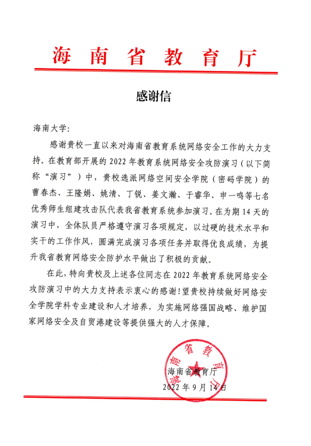 海南省教育厅致永利集团官网师生的感谢信