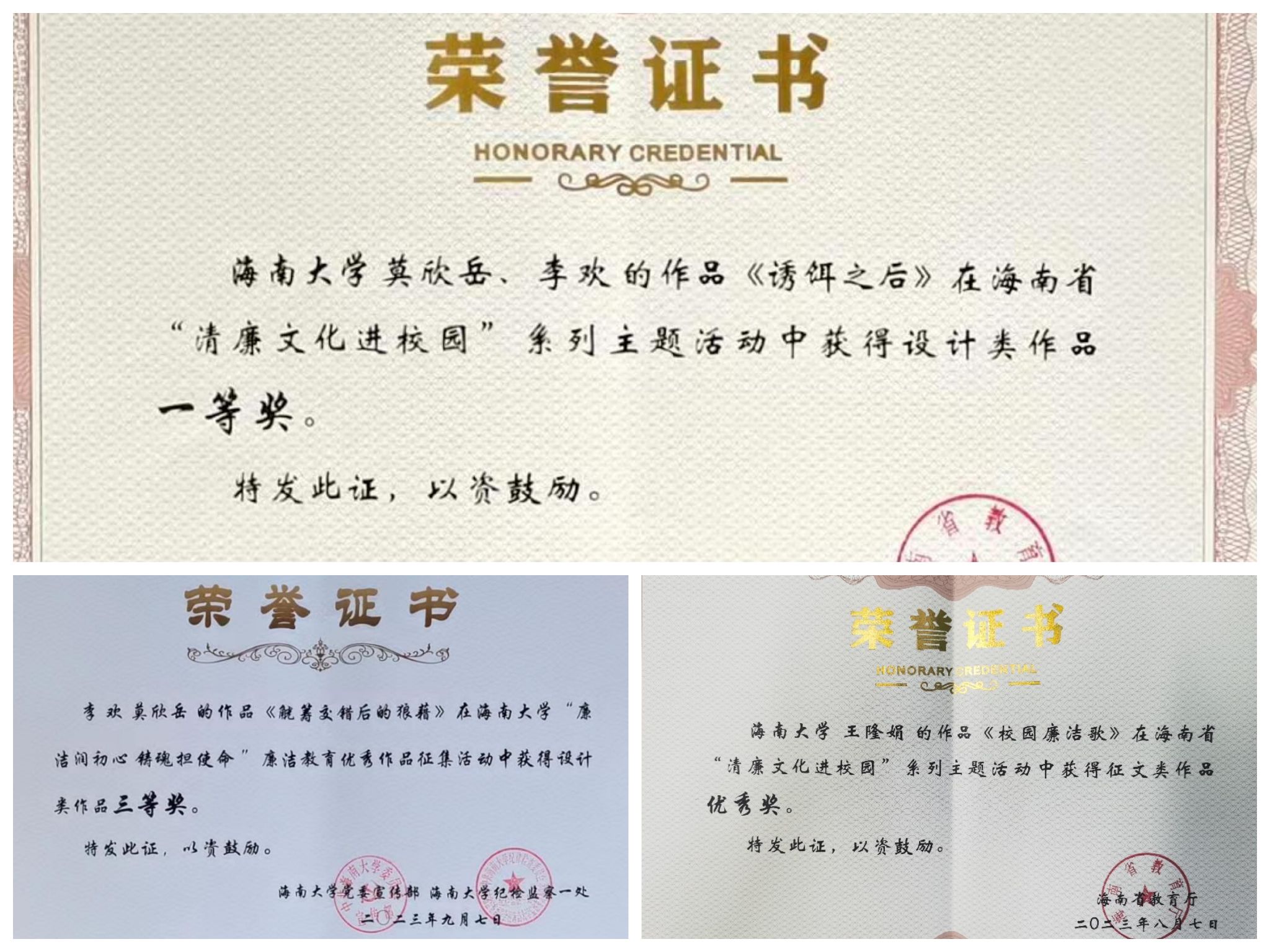 永利集团官网积极响应号召,组织动员教师参加此次活动,精心准备和报送了征文、设计等多幅作品。经专家评审,永利集团官网莫欣岳和李欢老师的作品《诱饵之后》获设计类作品一等奖,李欢和莫欣岳老师的作品《觥筹交错后的狼藉》获设计类作品三等奖,王隆娟老师的作品《校园廉洁歌》获征文类作品优秀奖,同时永利集团官网获得优秀组织奖。其中,作品《诱饵之后》和《校园廉洁歌》被学校推荐参加海南省“清廉文化进校园”系列主题活动作品评选,经海南省教育厅组织专家两轮评审和公示等环节后,最终分获设计类作品一等奖和征文类作品优秀奖。